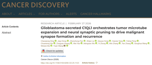 2月27日,四川大学华西医院生物治疗研究中心汪源/张燕研究员团队,联合清华大学/北京卓凯生物马伟伟博士、江西科技师范大学王松华副教授团队,在肿瘤学国际顶级期刊Cancer Discovery(IF:33.3)在线发表题为“Glioblastoma-secreted C1QL1 orchestrates tumor microtube expansion and neural synaptic pruning to drive malignant synapse formation and recurrence”的研究论文,发现胶质母细胞瘤(GBM)分泌的C1QL1是介导肿瘤—肿瘤、肿瘤—神经元通讯的关键信号分子,靶向C1QL1-BAI3-Rac1可同时阻遏TM和恶性突触形成、抑制肿瘤复发。