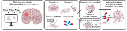 胶质母细胞瘤(GBM)是最常见、恶性程度最高的原发性脑肿瘤,患者预后极差。GBM呈现广泛的浸润性生长,浸润区肿瘤细胞难以通过手术+放化疗清除,是耐药和复发的重要原因。近年的研究表明,GBM细胞在侵袭初始阶段互不相连,但在定植后可生长出神经突样的肿瘤微管(TM)相互连接形成肿瘤网络,并与正常神经元形成功能突触(恶性突触),利用神经活动产生的电信号和旁分泌信号促进肿瘤生长、耐药和复发。然而,浸润区胶质瘤细胞如何通过肿瘤细胞间通讯促进TM和肿瘤网络形成、如何与正常突触竞争形成恶性突触的分子机制尚不清楚,核心信号分子尚不明确,也缺乏有效的干预策略。
