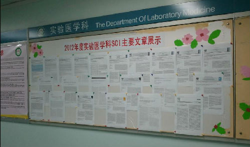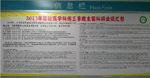 2013年10月初通过更新“2013年实验医学科前三季度主要科研业绩汇总”、“2012年度SCI主要文章展示”宣传展板改善工作氛围,学习充实头脑、积淀才气、升华境界。充分调动主动性、能动性,将培养人才梯队的价值理念落实到各项工作中,促进全科教职工树立阳光的价值观和事业观。