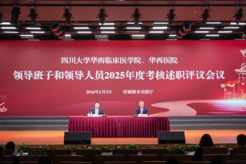 2月3日,我院在厚德楼多功能厅召开四川大学华西临床医学院、华西医院领导班子和领导人员2025年度考核述职评议会。校党委组织部副部长黄雯雯到会指导,程永忠书记、罗凤鸣院长等在家院领导、内设机构党委书记、教职工党总支(党支部)书记、临床医技科室主任、病区护士长、机关职能部处主要负责人、业务机构主要负责人、托管医院党政主要负责人等200余人参会。会议由罗凤鸣院长主持。
