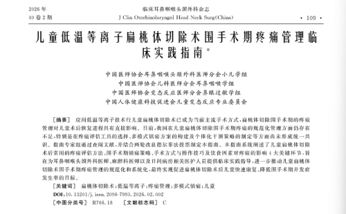 近日,我院耳鼻咽喉-头颈外科邹剑教授、吕丹副教授、雷蕾副主任医师作为专家组成员,深度参编的三部儿童耳鼻喉疾病诊疗相关指南在《临床耳鼻咽喉头颈外科杂志》正式发布,内容覆盖儿童扁桃体术后疼痛管理、日间手术规范化建设、开放性喉气管成形术规范化诊疗等关键领域,充分彰显了我院在该学科领域的学术地位与行业影响力。