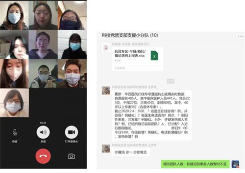 2020年1月26日(大年初二),我院院办、应急办紧急组织科技部、“双一流”建设办公室、临床研究管理部相关人员组建疫情专项协调办公室,统筹协调在线平台搭建、疫情咨询、跟踪随访等工作。2020年1月27日,科技党团支部发起号召,动员7人参与支援疫情专项协调组工作,组成科技党团支部疫情防控专项支援团队,实时跟进各组信息上报、在线培训、疫情咨询答疑、数据汇总、排班上岗、梳理跟踪随访病案、制作图表、量表测评等工作。疫情期间,团队充分应用信息化手段,采用微信线上远程协作办公方式,定时反馈工作问题,持续优化各个工作环节流程,是此次疫情防控专项工作后勤保障的核心力量。