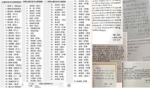 张岚教授受武汉精神卫生中心邀请,通过壹心理平台对武汉等湖北民众作《危机下的心理调适》讲座,并与广大网友进行交流互动,为湖北加油,收看量达5万余人次;受邀四川频道科普节目直播收听量达50万余人次。教学主任郭万军教授在央视频直播“新冠疫情下的成瘾相关健康问题”,做客神鸟知讯传播系《今晚800》特别节目“成都战役情”,全网直播数据达71.2万。四病房负责人张骏副教授作为四川新冠大众心理干预科普文章的负责人,现已参与主编全国第一本针对疫情的心理防护图书——《新型冠状病毒大众心理防护手册》,阅读量已有10万+;受邀四川交通广播电台FM101.7进行“抗击疫情特别节目”收看人数达67.4万。心理治疗师陈婷受四川省国际医学交流促进会邀请进行“战疫心力量—开出战疫心理良方”,实时在线收看人数达252万。刘阳副教授在喜马拉雅APP上录制“新冠减压专辑--正念减压音频”,收听量达4万余次,并在中国医学论坛报发表“新冠病毒肺炎期间医务人员的自我照护与心理调适”。李涛主任、罗珊霞护士长主编心理热线支持手册;孟宪东科护士长在《华西循证护理》发表“华西护理紧急推荐:新冠患者心理护理要点”;四病房护士长余建英、卓瑜做好病房防控措施,开展线上团队心理建设,关爱员工心理健康……