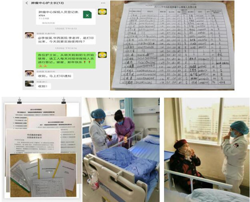 2020年1月24日(大年三十)至27日(初三),符琰护士长作为党员,坚守病房,落实肿瘤中心制定的患者及陪伴制度,检查护士对患者及陪护人员新冠肺炎流行病学史及症状筛查情况,检查院患者及陪伴信登记息是否完整,陪伴体温2次/天监测是否到位。符琰还与院感护士吴洪美一起制定了《医院感染防护措施落实查检表》,对新冠状肺炎防控措施、消毒隔离制度、手卫生、防护用品穿脱、用物处理、垃圾分类处理等落实情况每日动态检查、及时反馈,对落实不到位的人员给予及时纠正。
