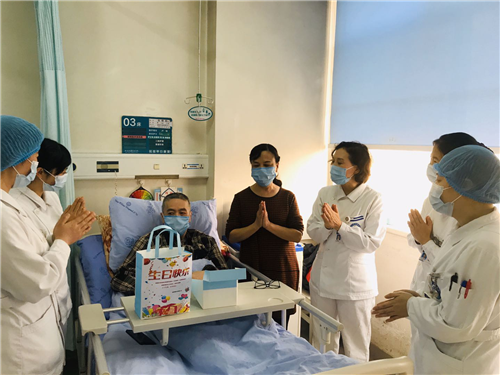 3月21日,一位住院患者及家属要求回家休息,由于疫情管控要求,护士没有同意其要求,家属表现出不满的情绪。主管护士刘芯池与患者沟通后了解到这天是他62岁的生日,想要回家过生日。为了满足患者心愿,并且保障疫情管控,科护士长给患者及家属做了耐心的解释工作,家属表示理解。为了给患者过特殊的生日,护士长安排给患者买了蛋糕,制作了生日贺卡,科护士长、护士长、工会组长、主管护士一起为患者送上生日蛋糕、生日贺卡,邀请同病房的病友一起为患者合唱生日歌,给患者过了一个不寻常的生日。患者及家属含泪不停的说“谢谢您们”,疫情无情,病房有爱。
