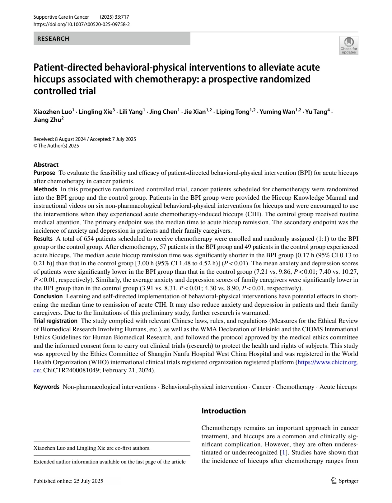 近日,我院肿瘤一科医护团队在国际癌症支持治疗领域权威期刊《Supportive Care in Cancer》(MASCC官方期刊,Q1区,影响因子3.0)发表原创性研究《患者主导的行为-物理干预有效缓解化疗后急性呃逆并减轻患者及家属心理负担》,首次验证了患者主导的行为-物理干预(BPI)对化疗后急性呃逆的显著疗效。