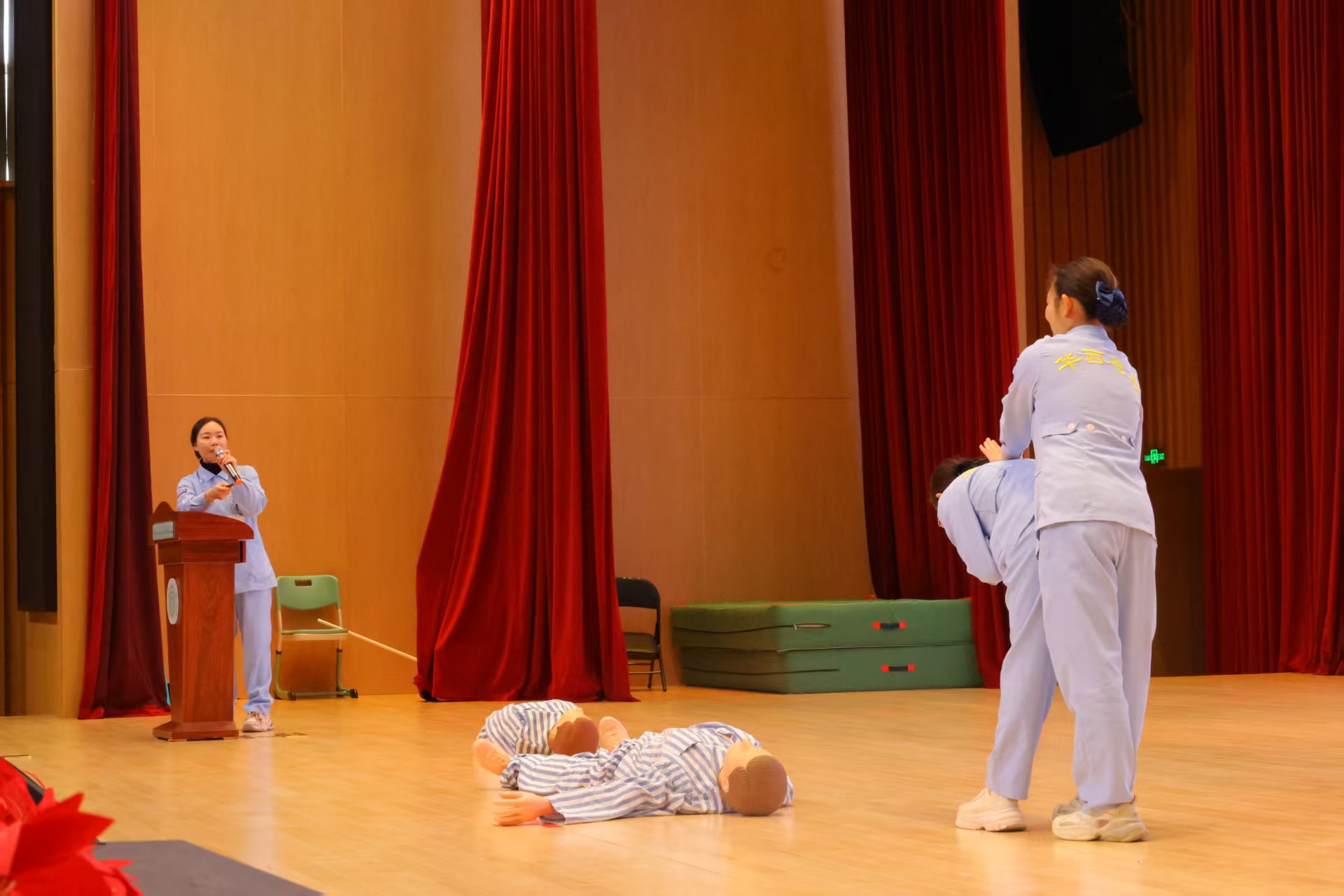 讲座现场,我院急诊科护理专家韩存巧以校园常见突发意外为切入点,用通俗易懂的语言、真实案例,讲解急救“黄金4分钟”的重要性,明确急救处置的核心原则:先判断、再呼救、后施救。针对心肺复苏,讲师拆解标准流程:确认环境安全、判断意识呼吸、立即拨打120、胸外按压、开放气道、人工呼吸,逐一强调操作要点。与此同时护理专家黄雪梅护师借助模拟人教具,分步演示、纠正动作,让学生直观掌握规范要领。针对气道异物梗阻这一校园高发危险场景,我院急诊科护理专家李启奉重点讲解海姆立克急救法实操技能要点,同时区分成人、儿童与婴儿操作差异,提醒孕妇、肥胖者改用胸部冲击,避免误伤。