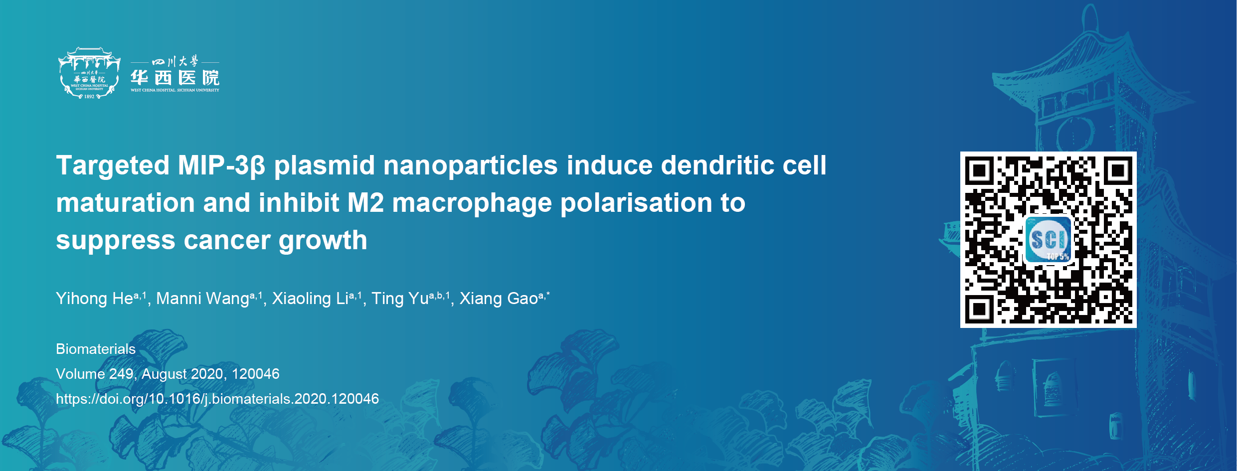 四川大学华西医院神经外科高祥研究员团队于2020年8月在“Biomaterials”(影响因子10.31,在JCR“生物材料”类别38种期刊中排名第1位)发表文章“Targeted MIP-3 beta plasmid nanoparticles induce dendritic cell maturation and inhibit M2 macrophage polarisation to suppress cancer growth”(长按下方二维码即可阅读全文)