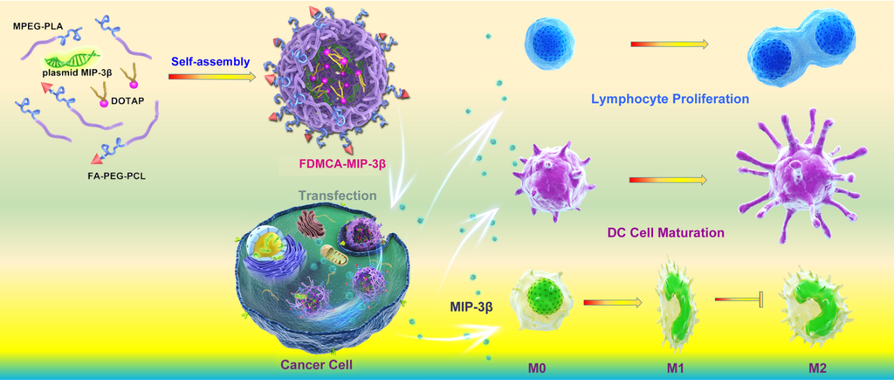 The schematic illustration of FDMCA transfection and immune activation. Cancer cells were transfected with FDMCA-pMIP-3β and secreted MIP-3β factors to induce immune activation, which prompted lymphocyte proliferation and DCs maturation, as well as inhibition of macrophage polarisation to M2.