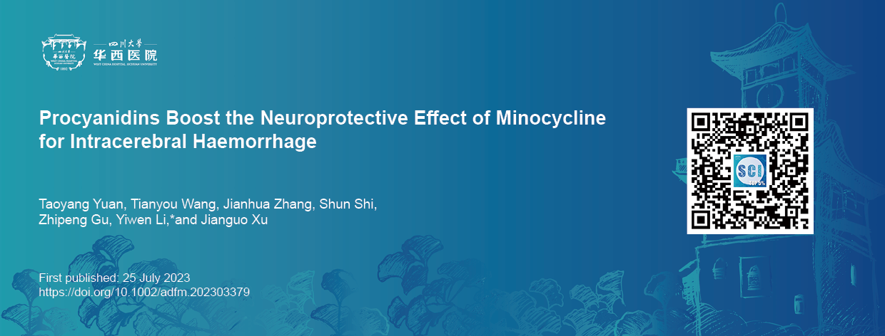 四川大学华西医院神经外科/研究室徐建国团队和四川大学高分子科学与工程学院李乙文团队于2023年7月在 Advanced Functional Materials 发表医工结合学科研究文章 “Procyanidins Boost the Neuroprotective Effect of Minocycline for Intracerebral Haemorrhage”( 点击二维码阅读原文)。该研究显示天然多酚如原花青素等和米诺环素能成功构筑粒径均一、形貌良好的纳米粒子,并且该纳米粒子在体外实验和动物实验均被证实具有增强的自由基清除和铁螯合性能,对脑出血病症中的神经系统起到更为良好的保护性能。