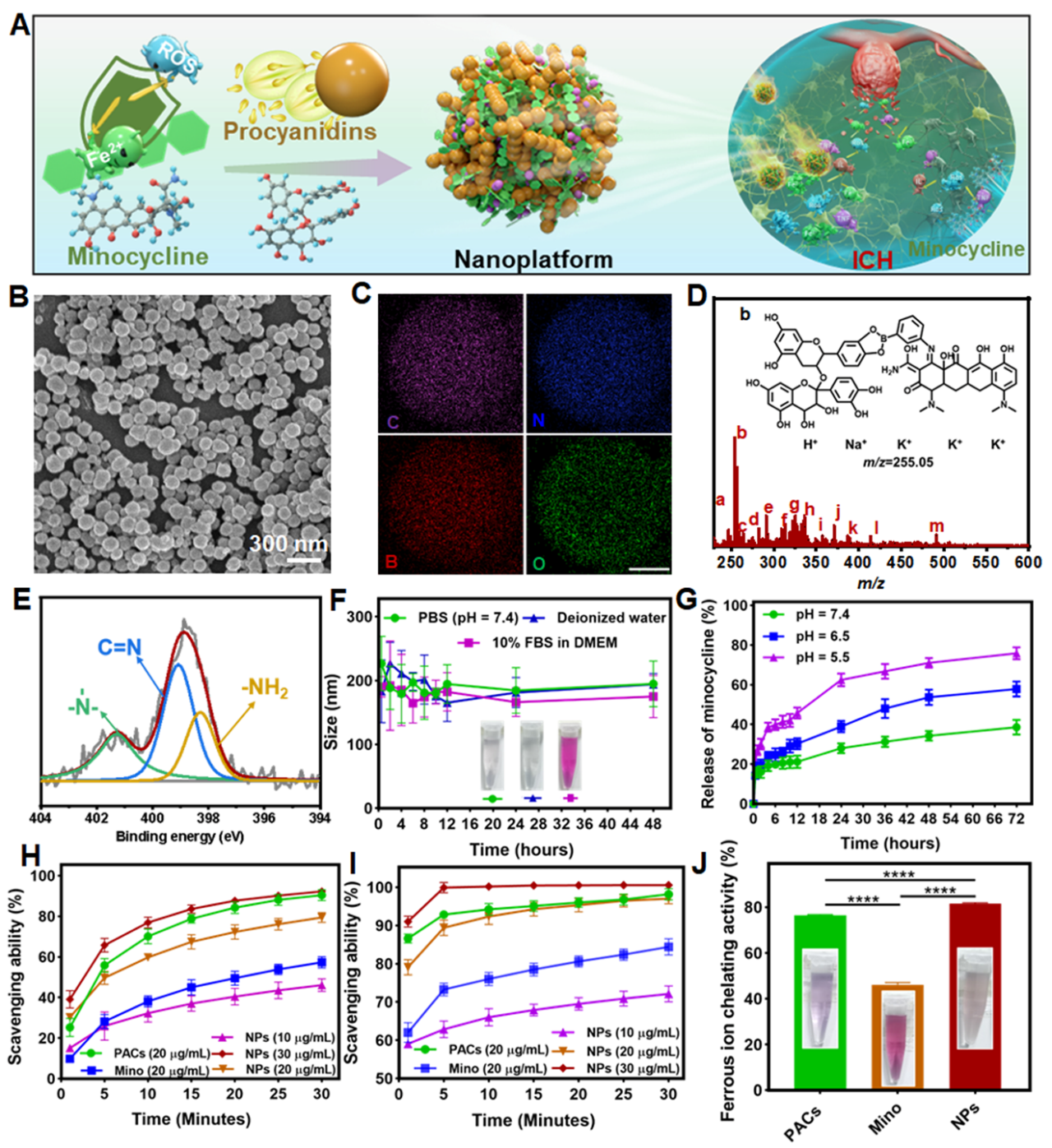 ICH是一种严重的、危及生命的中风类疾病,尽管及时止血和清除血块可以挽救患者的生命,但ICH后的继发性损伤,包括神经炎症、铁超载神经毒性和氧化应激等引起的神经功能缺损,仍然是幸存者中死亡率最高(1个月≈40%)和严重残疾的原因。因此,神经保护方法已被认为是改善ICH后患者生活质量的有效治疗策略。迄今为止,由于出血部位病理环境的复杂性和多样性,主要通过阻断或减轻继发性损伤单一机制发挥神经保护作用的药物在临床实验中并没有达到令人满意的结果。越来越多的证据显示多功能重塑出血部位复杂多样病理微环境的整合治疗策略在ICH的治疗中具有更为明显的优势。天然多酚是一类天然存在的具有丰富酚羟基结构的化合物,可作为多种生物功能材料的构筑基元,包括抗氧化、抗炎、金属螯合、抗菌、光热等功能。因此,我们提出以天然多酚如原花青素为平台,3-氨基苯硼酸为媒介,二者通过硼酸酯键和希夫碱键与米诺环素共聚形成具有pH响应释放米诺环素性能的纳米粒子,期望能获得具有更为有效清除ROS、抗炎和铁螯合能力的纳米药物制剂。因此,本研究在纳米制剂的构筑上具有一定的新颖性和普适性,进一步可拓展到其它神经损伤的治疗研究中。