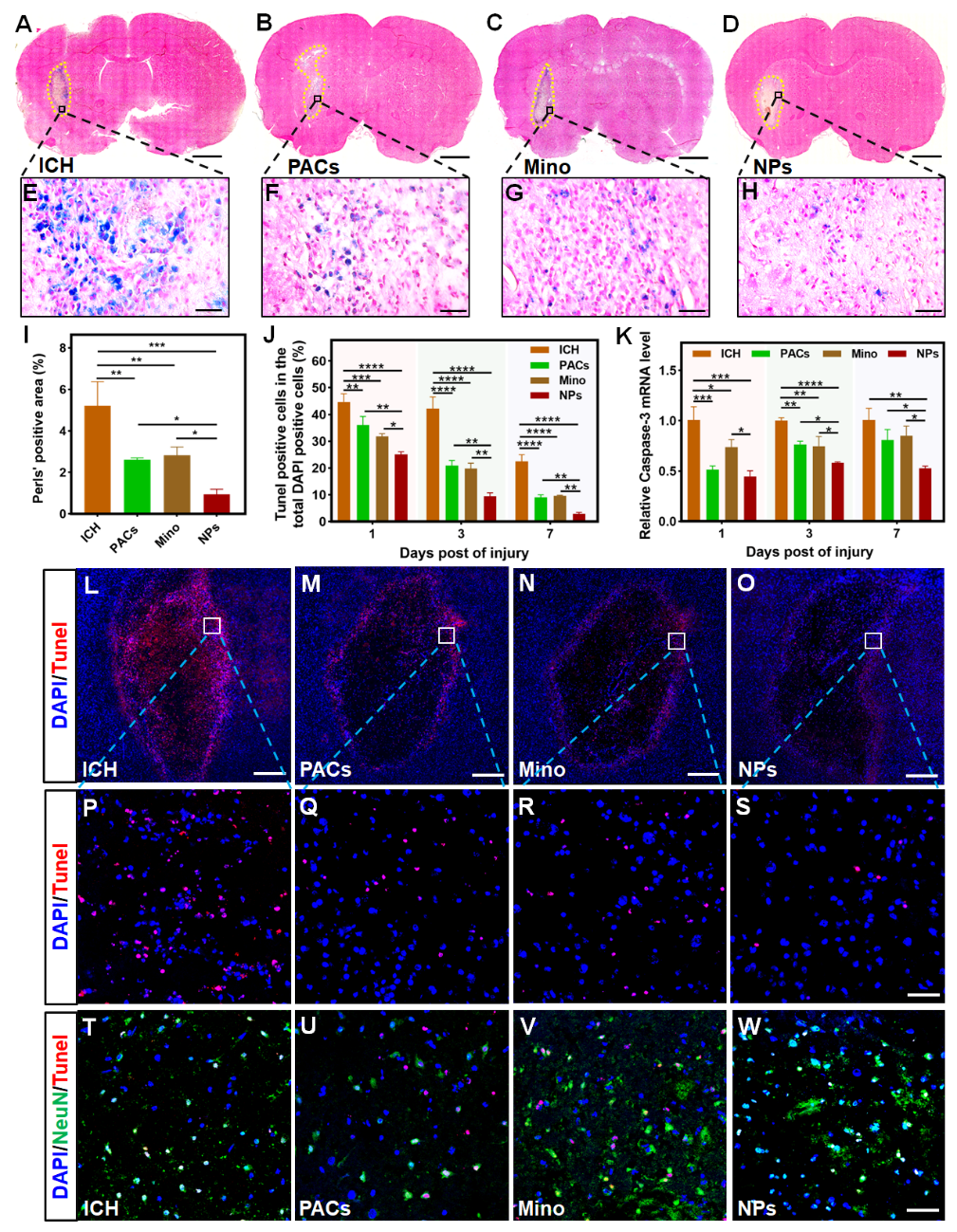 本研究以双功能适配器3-氨基苯基硼酸为媒介,通过动态硼酸酯键和希夫碱键将PACs和Mino整合形成具有pH响应特征的PACs-Mino纳米颗粒(NPs)。所得NPs粒径均一、形貌良好,并具有强有力的ROS清除能力和铁螯合能力(图1)。在体外细胞实验和ICH大鼠模型中,NPs通过其更强的ROS清除、抗炎和铁螯合特性,在ICH早期再次发挥了优异的神经保护作用(图2)。此外,相对于单一的PACs和Mino分子,NPs可以显著促进ICH大鼠ICH区域神经解剖的稳定性,并加速神经行为功能的恢复。本研究促进了以天然多酚为平台的纳米药物的开发和临床应用,从而提高ICH治疗药物的性能,进一步可推广到其他中枢神经系统损伤,如脑损伤和脊髓损伤。