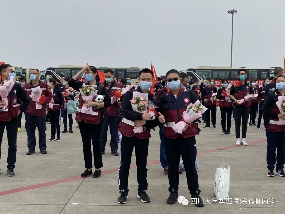 今日下午,四川大学华西医院心脏内科驰援武汉前线参加抗击新冠肺炎疫情的三位英雄——徐原宁、彭勇、贺莉,在历时2个月的艰辛抗疫工作后,与其余138名四川大学华西医院驰援武汉前线的援外医疗队员,一同乘坐川航专机从武汉前线凯旋归来,我科陈晓平书记代表党支部及科室亲自前往机场迎接英雄们回家。