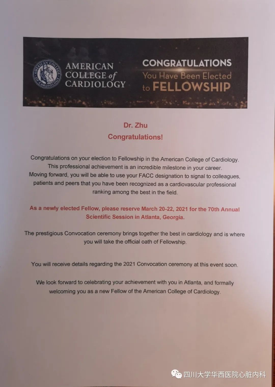 近日,我院心脏内科祝烨教授被美国心脏病学会(American College of Cardiology,ACC)授予资深专家会员(Fellow),以肯定其在心血管病学领域所作出的突出贡献。