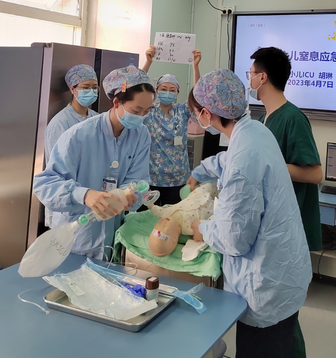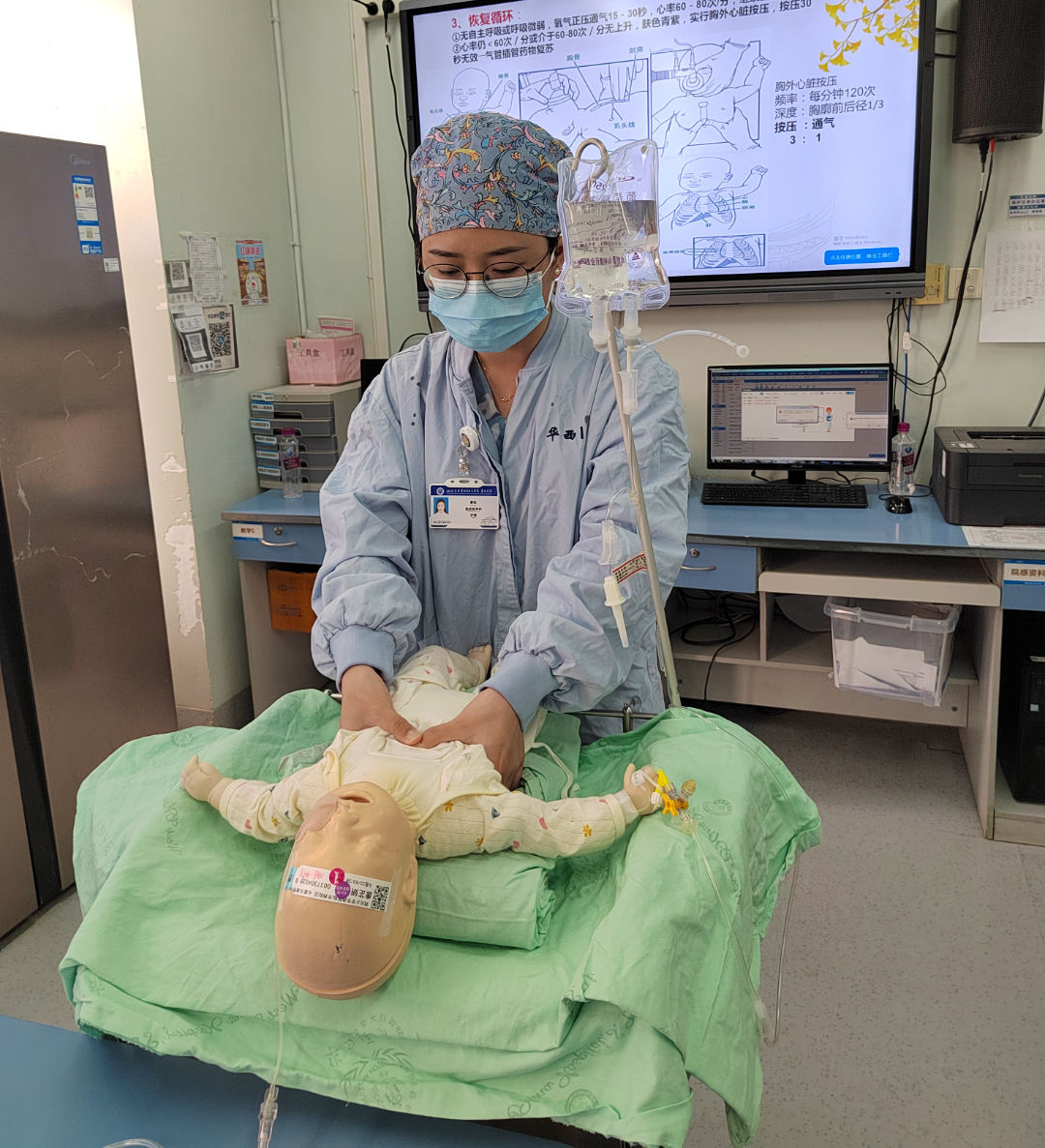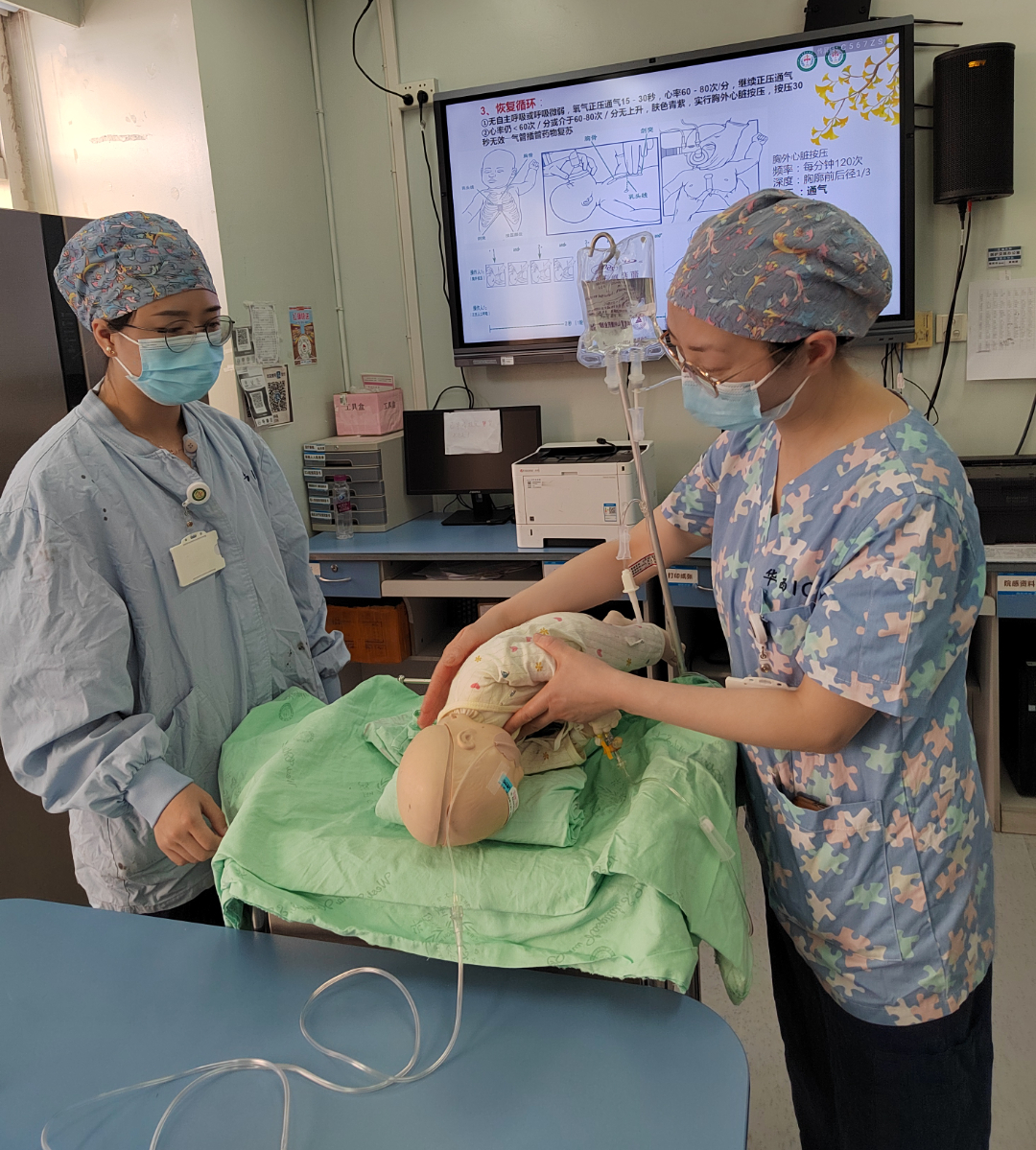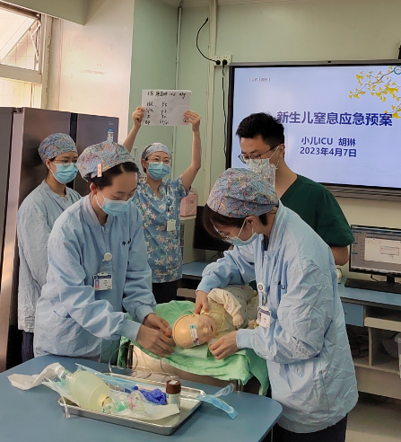这个演练有两大特点:一是基于案例和情景为基础,还原临床中的真实情景,模拟了一例先心病术前新生儿因呛奶引起窒息的突发事件,医护技团队立即启动应急预案并抢救成功的过程;二是团队协作,演练人员模拟的角色包含1名住院总、1名值班医生、1名呼吸治疗师和责任护士三名(1名责任护士,也为第一发现者;1名记录护士;1名用药护士),演练的内容包括病情识别、紧急呼救、通畅气道、建立呼吸、正压通气、恢复循环、药物治疗、复苏后监护等内容,每位参与演练者按照角色和职责要求,行动敏捷,有条不紊,有序开展抢救工作。