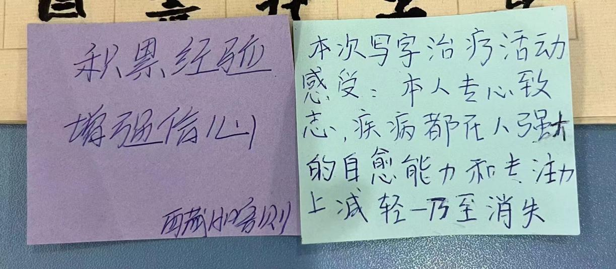 本活动中,我们邀请到了家属参与。家属与患者一同执笔创作,不仅为患者提供了稳定的陪伴与支持,也在共同的专注时光中缓解了自身的照护压力,增进了对患者的理解。不少家庭表示,这种平等的互动创造了新的沟通场景,改善了家庭关系,营造出温暖正向的情感氛围。活动后,患者和家属纷纷对病房的康复工作表达了肯定,一位藏族同胞还发挥自己的创作能力,用藏语对所有患者和工作人员表达了美好祝愿!